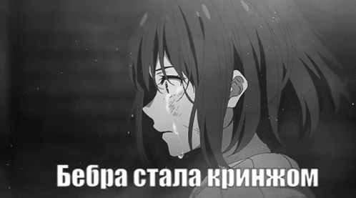 Animated black and white scene of a crying anime girl with the text 'Bebra became cringe'.