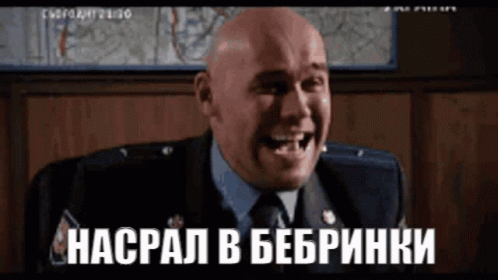 A bald man in a uniform laughs hysterically, with Russian meme text 'Shit in bebrinki' displayed on screen.