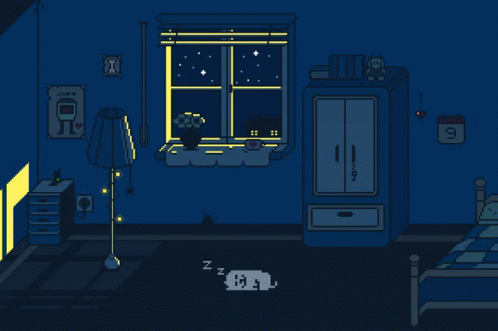 A cozy pixel art bedroom scene at night, featuring a small white dog peacefully sleeping on the floor.