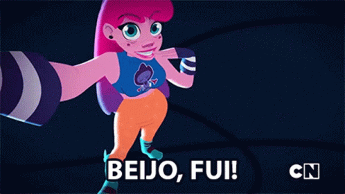 Any Malu, the animated character, takes a selfie with the phrase 'Beijo, Fui!' and a peace sign.