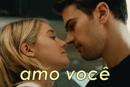 A romantic couple shares a tender forehead kiss, expressing affection with the visible Portuguese phrase 'amo você' (I love you).