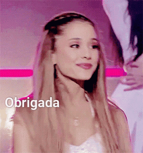 A woman with long hair smiles and blows a kiss, with 'Obrigada' text displayed.