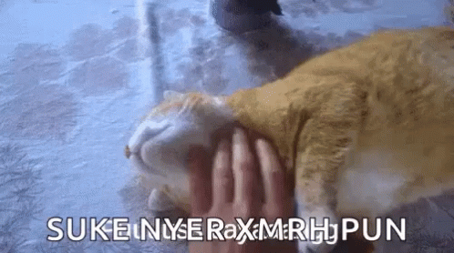 A person gently strokes a relaxed orange cat, which seems to be enjoying the affection.