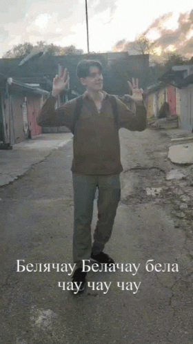 Man in brown sweater dancing and gesturing on a street to the 'Belyachau' chant.