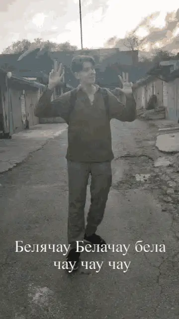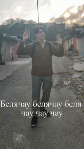 Man performs a dance with hand gestures to the 'белячау пандокус' song in an urban setting.