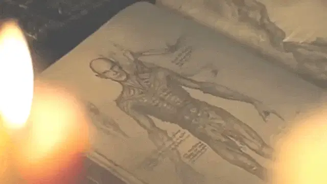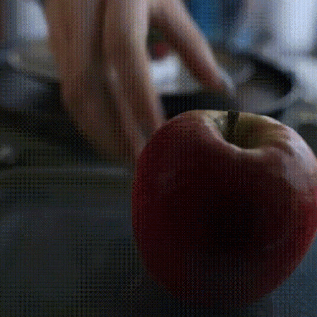 Belinda takes a bite from a red apple, looking directly at the camera with a confident expression.