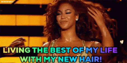 A woman, possibly Beyoncé, confidently shows off her new hair, exclaiming she's living her best life.