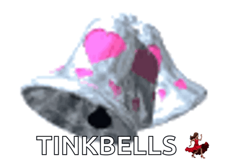 A white bell adorned with pink hearts, featuring the text 'TINKBELLS' and a dancing woman emoji.