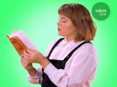 Marieli, an ambassador for Salon Line, reads a book while nodding, showcasing a moment of beauty and focus.