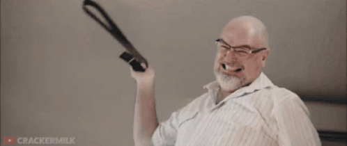 A bald man with glasses and a beard comically wields a belt, acting out a 'dad' stereotype.