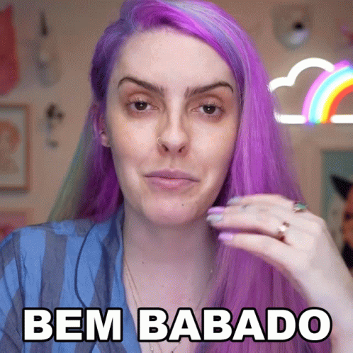 Karen Bachini, with vibrant purple hair, says 'Bem Babado' in front of a rainbow light, showcasing her style.