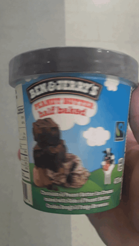 A person is holding a tub of Ben & Jerry's Peanut Butter Half Baked ice cream.