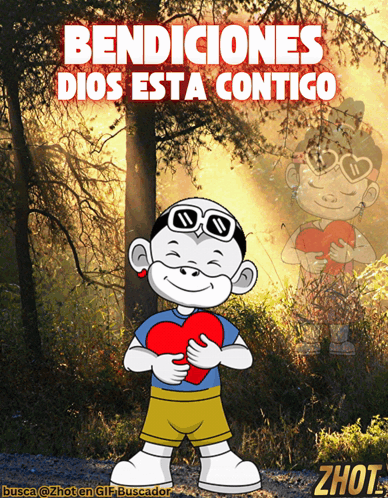 Animated monkey character Zhot holding a heart, conveying blessings and the message 'God is with you'.