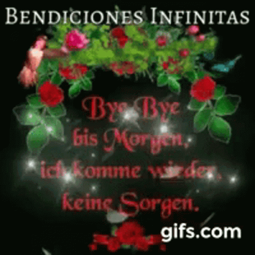 Animated message 'Bye Bye until tomorrow, I'll come back, no worries' with infinite blessings, birds, and flowers.