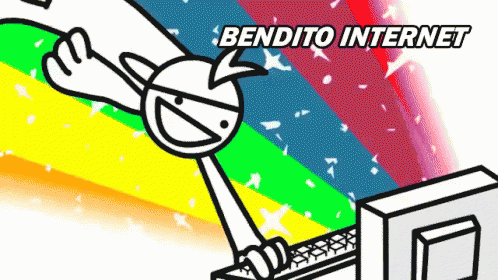 A cartoon character happily using a computer with a vibrant rainbow background and the text 'Bendito Internet'.