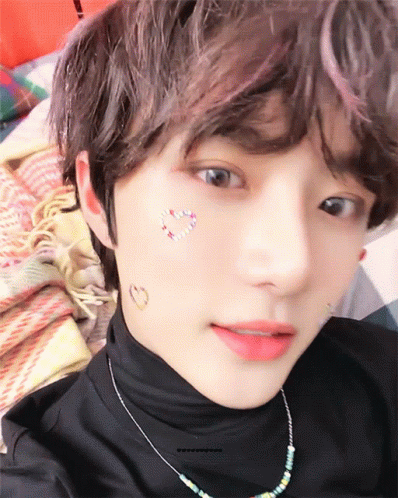 Beomgyu posing with heart-shaped face stickers and a beaded necklace.