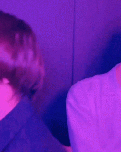 Beomgyu of TXT captured in a close-up, illuminated by vibrant purple and pink lights.