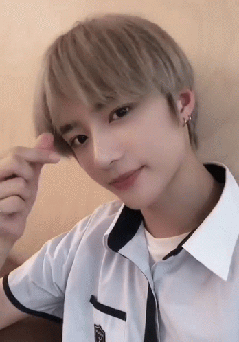 Beomgyu Txt making a finger heart gesture, looking sweet and adorable with light brown hair.