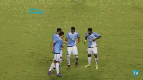 Brazilian footballer Bergson celebrates a goal with his Paysandu teammates on the field.
