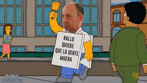 Gonzalo Bernardos as a Simpsons character holding a sign about Rallo, saying 'Rallo wants people to die'.