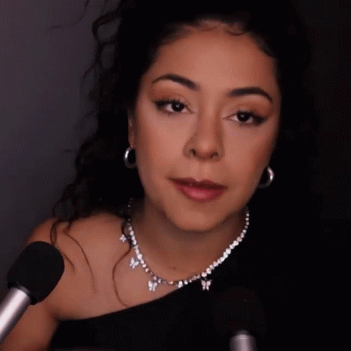Merith Aranda blows a kiss for ASMR, wearing a butterfly necklace and hoop earrings in front of microphones.
