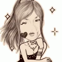 A charming black and white caricature of a woman blowing a kiss, adorned with sparkling effects.