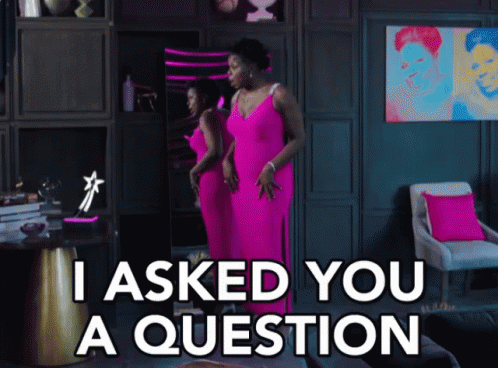 Leslie Jones in a vibrant pink dress, looking into a mirror and emphatically asking, 'I asked you a question.'