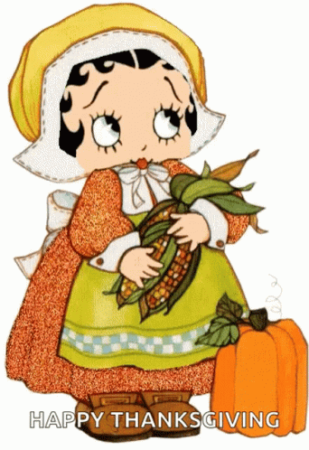Betty Boop holding corn and a pumpkin in an autumn-themed setting, perfect for Fall or Thanksgiving.