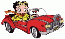 Betty Boop drives a red convertible car, waving goodbye with 'Bye Bye!' text.
