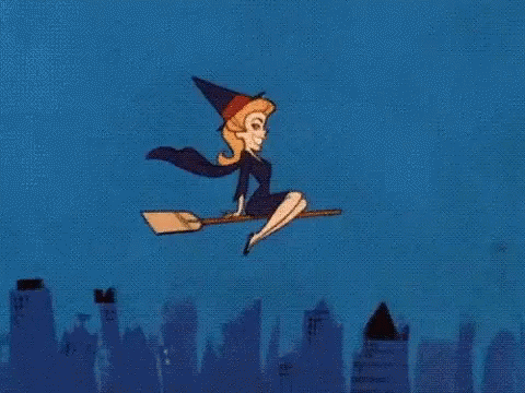 A cartoon witch, reminiscent of Bewitched, flies across the night sky on her broomstick.