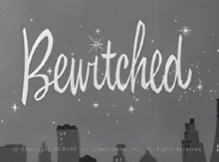 The classic black and white opening title sequence for the TV show Bewitched, featuring a flying witch.