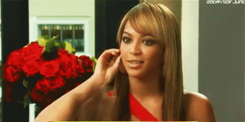 Beyonce smiling and adjusting her hair, with a bouquet of red roses in the background.