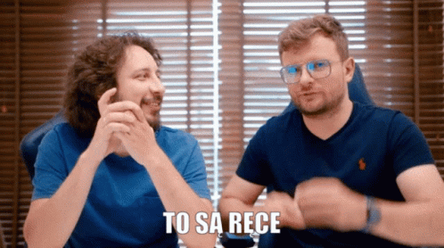 Karol Paciork and another man reacting to something with the phrase 'Rece Opadaja' (Hands Dropping).