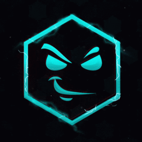 An animated hexagonal logo featuring a glowing, mischievous face, with dynamic lightning and color effects.