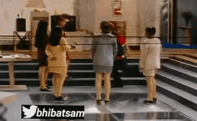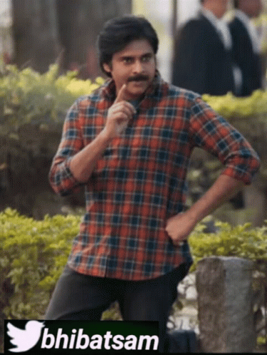 Pawan Kalyan, the actor from 'Vakeel Saab', stands outdoors in a plaid shirt, pointing, with 'bhibatsam' text.