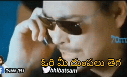A man in sunglasses talks on a cell phone, delivering humorous Telugu dialogue from 'Bhibatsam Telugu Comedy'.