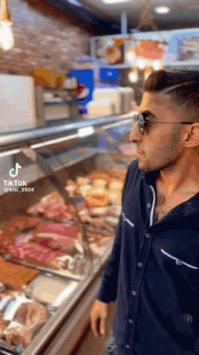 Man in sunglasses picks up large sucuk sausages in a Turkish butcher shop.