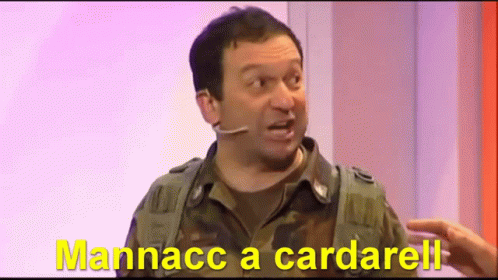 Italian comedian Biagio Izzo, in military uniform, comically exclaims 'Mannacc a cardarell!' on stage.