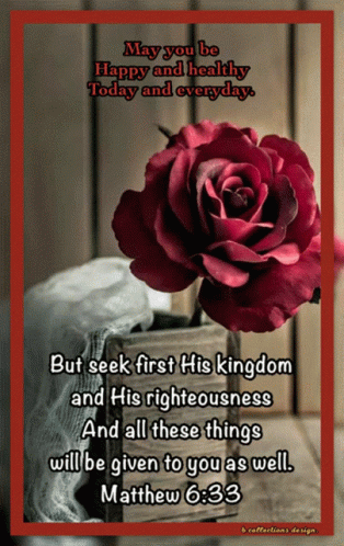 A beautiful red rose in a wooden box with an uplifting Bible verse from Matthew 6:33 and a daily blessing.