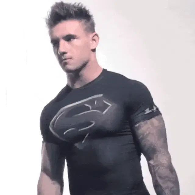 Qwerty performing intense bicep curls in an American flag tank top at the gym.