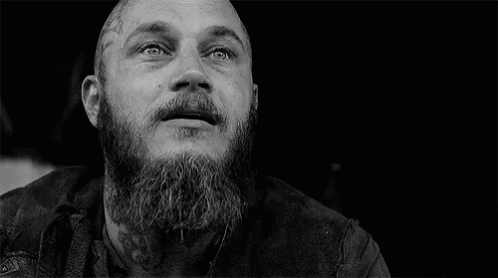 Ragnar Lothbrok, from Vikings, looks sad and covers his face in a black and white scene.
