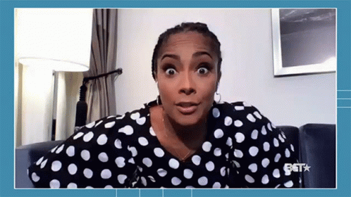 Amanda Seales makes a surprised face with wide, 'big eyes' while wearing a polka dot shirt.