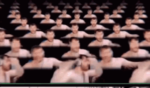 Bigt Isaacwhy appears as a multiplied audience, with many identical figures sitting at desks with headphones.