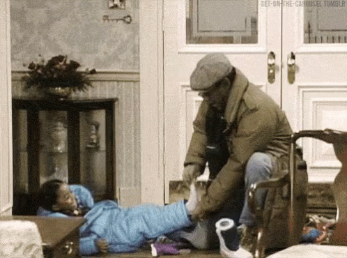 Bill Cosby kneels to put socks on a child, Rudy Huxtable, who is lying on the floor in a scene from The Cosby Show.
