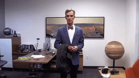Bill Nye, dressed in a suit and bow tie, stands alone in an office setting, holding a jacket.
