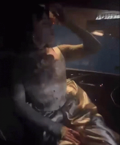 Billie Eilish in a light-colored dress, posing or dancing in the back of a car with pink lighting.