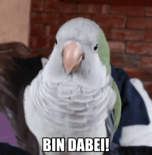 White and green parrot enthusiastically nodding its head with 'BIN DABEI!' text overlay, showing agreement.