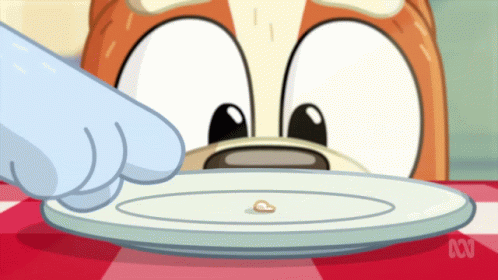 Bluey, the cartoon dog, stares intently at a minuscule piece of food on a plate, eyes wide with anticipation.