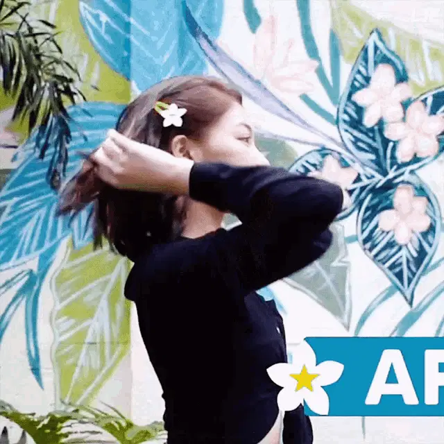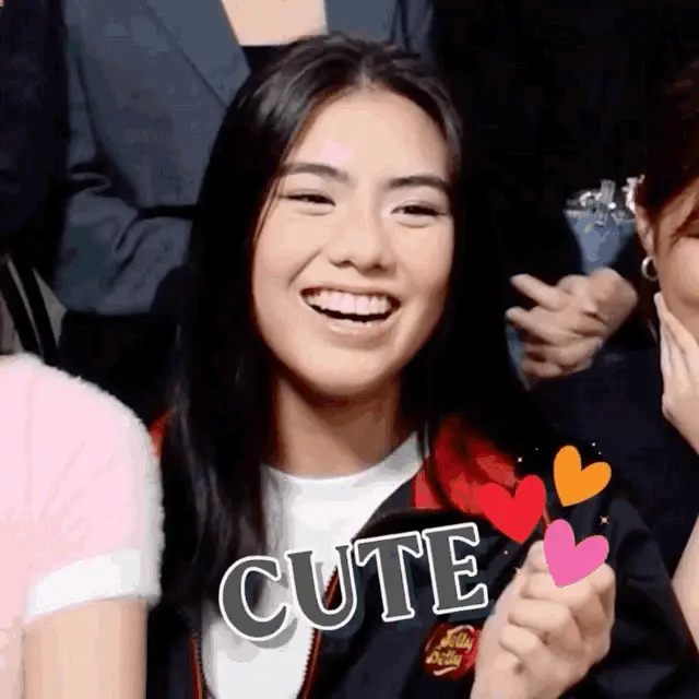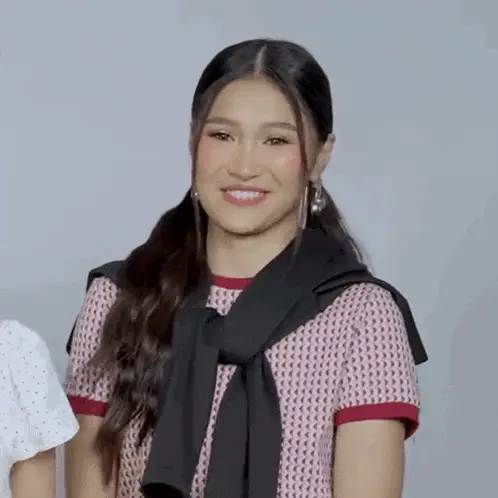 BINI member Gwen smiles brightly, wearing a white t-shirt and a ruffled purple dress.