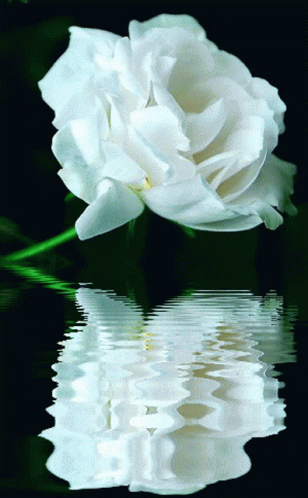 A beautiful Biosenca Camellia flower, white and pristine, reflected perfectly in calm water.